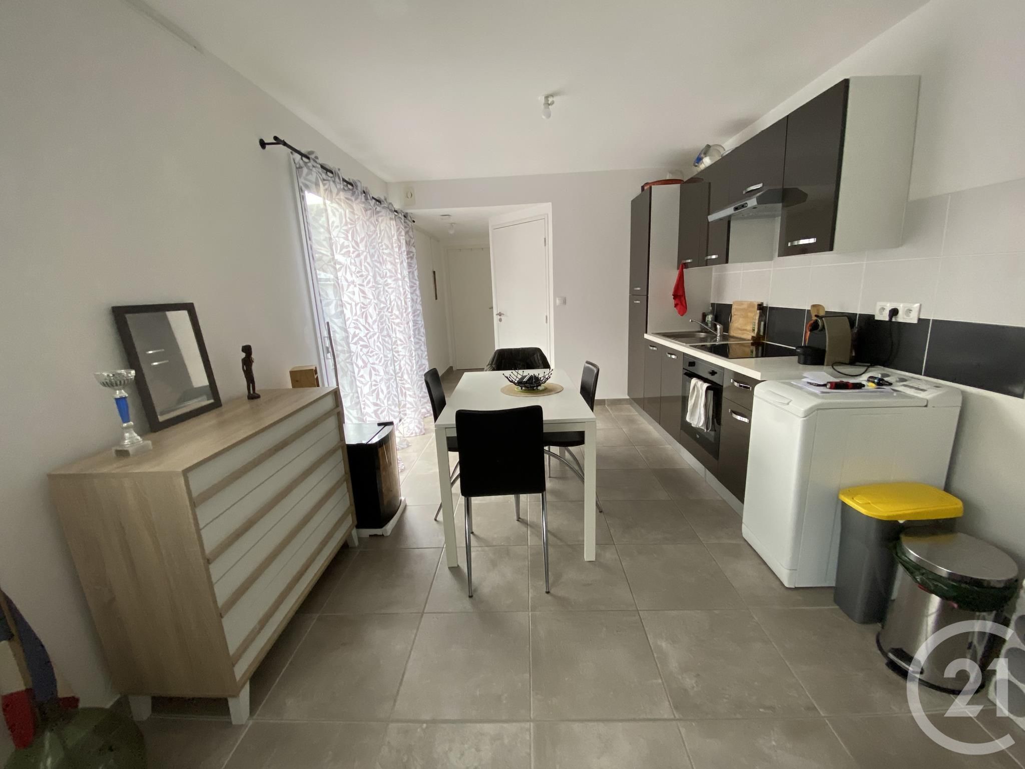 Situé en rez de chaussée, ce bien se compose d'une entrée avec placard, donnant sur la pièce de vie lumineuse avec cuisine ouverte. La cuisine est aménagée et équipée d'une plaque, hotte,four, réfrigérateur, évier et rangements.